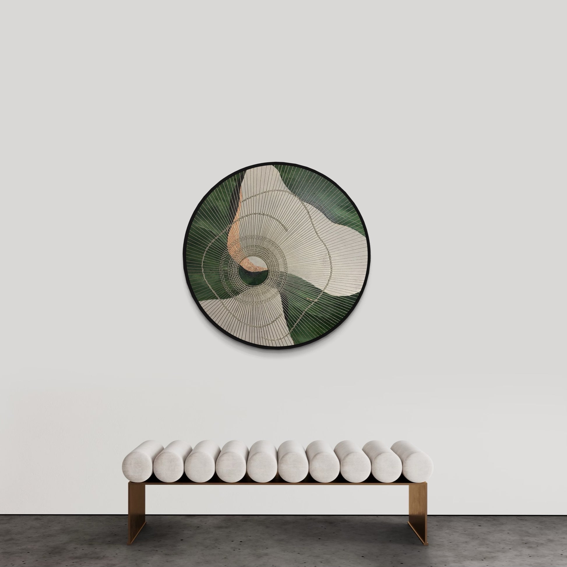 Thread, textile, mixed media on panel.